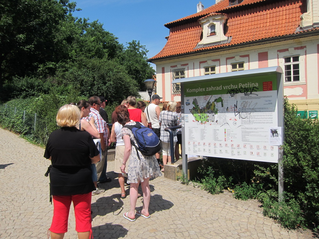 From there, it was a 10-15 minutes tram ride to Petřín Hill. When we arrived at Petřín Hill, the funicular (the tram to go up the hill) had a long queue. Standing in the hot sun to wait for the tram wasn’t exactly fun, so we decided to walk up to the mid-way point (the funicular stops mid-way).