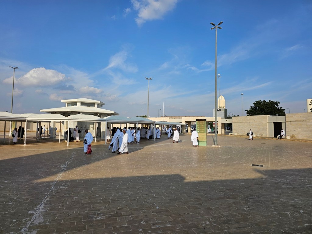 Given that we are planning to perform umrah tonight, we had to perform the miqat (ritual to initiate intention and wearing ihram). The nearest miqat point for us was Qarn Al Manazil. All miqat points are essentially a mosque with facilities to change. There were quite a number of other pilgrims there too performing miqat.