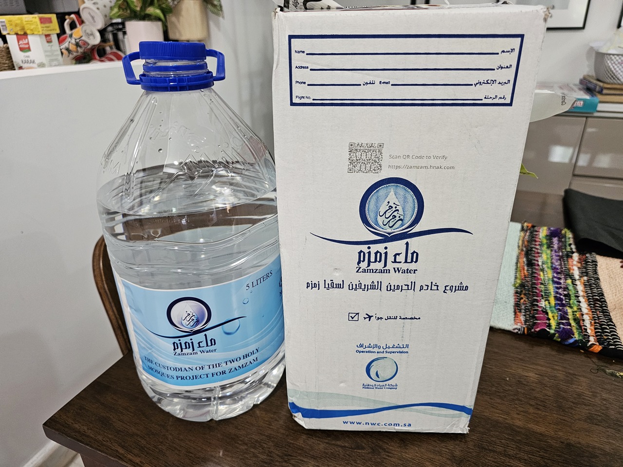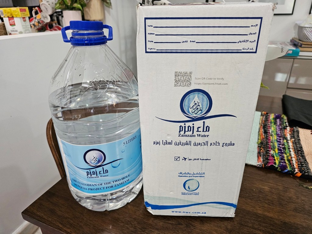 At the airport, the mutawif gave us our pre-packed zam-zam water. About 20 years ago, the pilgrims had to buy their own empty bottles and fill in the zam-zam water themselves. The pre-packed zam-zam now is much easier to carry around.