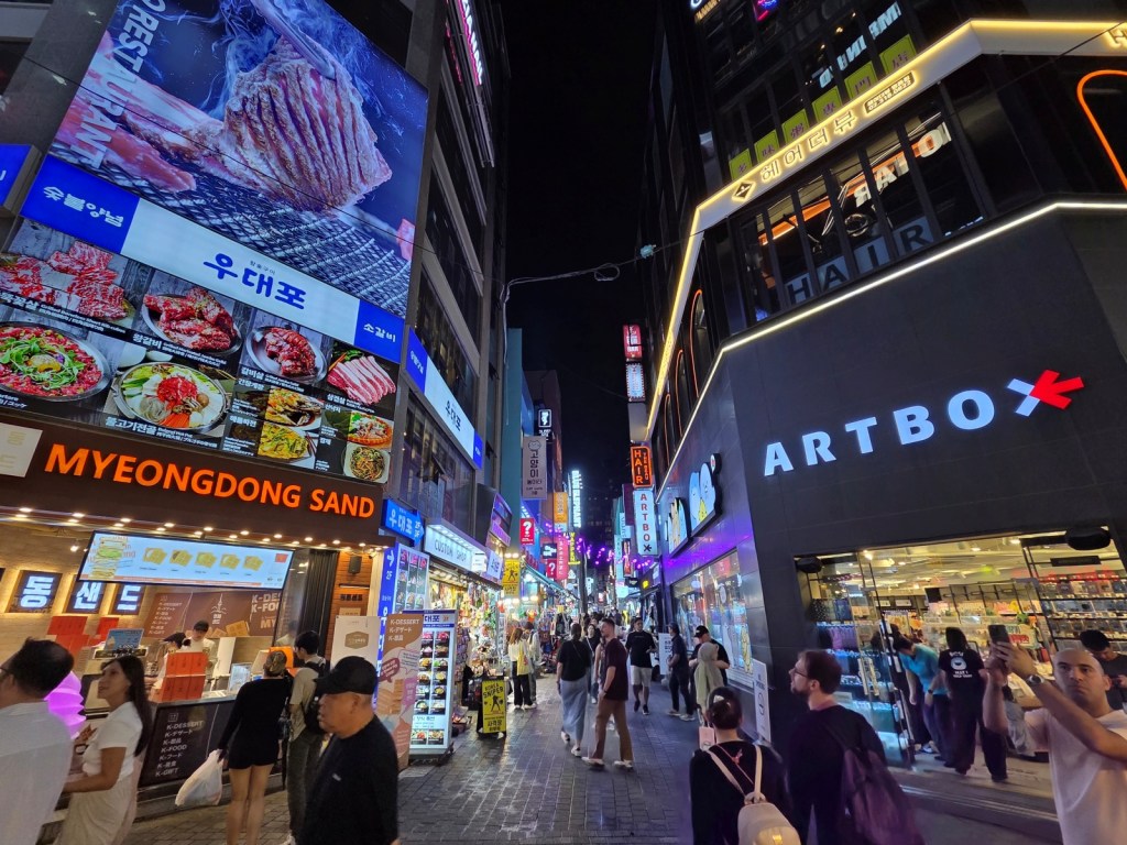 After dinner, we explored the nearby Myeongdong area. Myeongdong is known as the main shopping district in Seoul. There are major department stores and well known stores in the area.