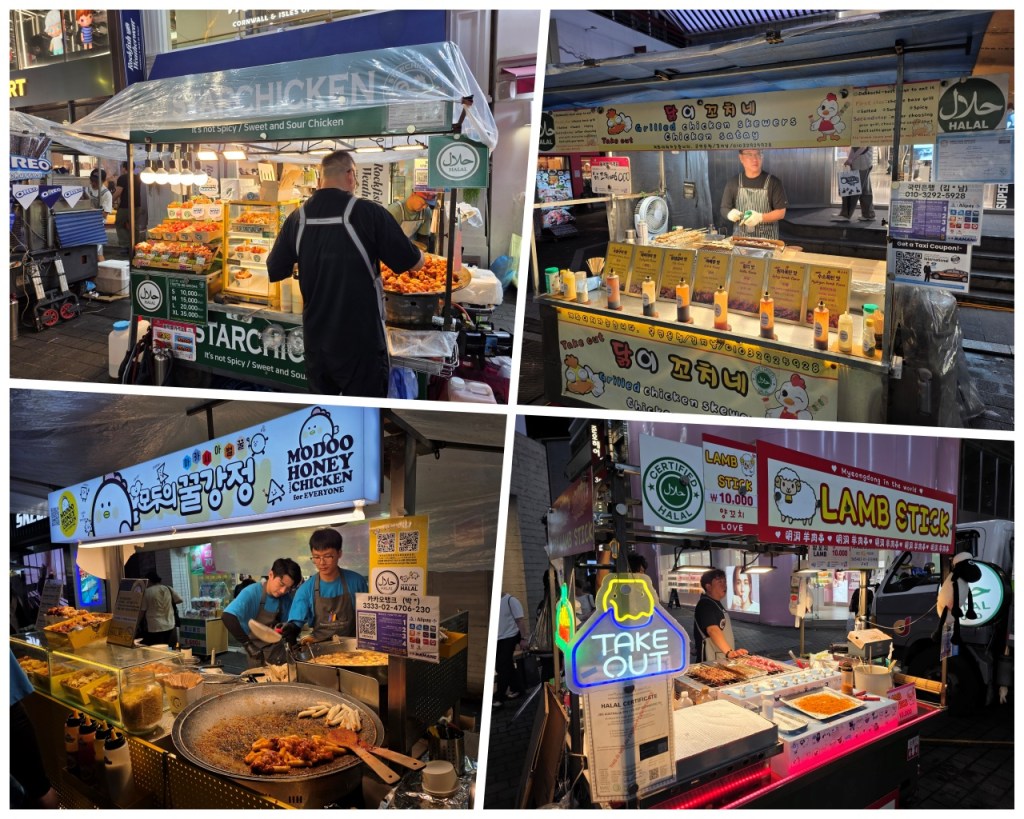 In the evening, Myeongdong it is also known for having a food market. I also noticed there were some halal food stalls too. As we just had dinner, we only bought a bit of the snacks to give it a try. We plan to come back the following day to taste more of the street food.