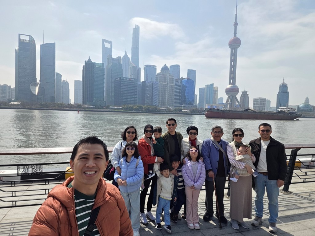 We took a family photo with the background of the famous Shanghai skyline.